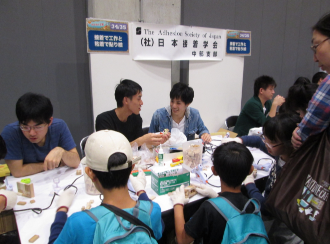 日本接着学会中部支部は、「粘着で貼り絵」と「接着で工作」の2つのタイトルで出展し、今回も多くの子供たちに参加していただきました。来場した子供たちに、"接着の楽しさや接着剤の扱い方を学んでもらう"というテーマの下、接着の面白さを体験していただき、柔軟な発想と創意工夫で子供たちに工作していただきました。